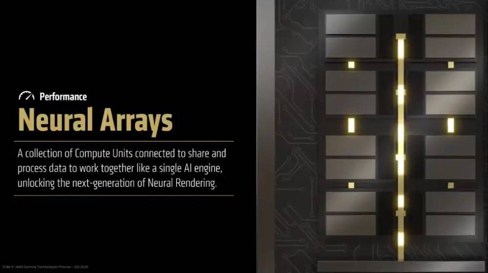 据引见,新架构的焦点之一是“神经阵列”(Neural Arrays)手艺,这是一品种似“无限总线”(Infinity Fabric)的 GPU 内部互连方案。虽然该手艺毗连的是计较单位的全体,但其次要方针是特地优化和加快 AI 衬着使命,这预示着 AI 将正在将来从机的图形处置中饰演更焦点的脚色。