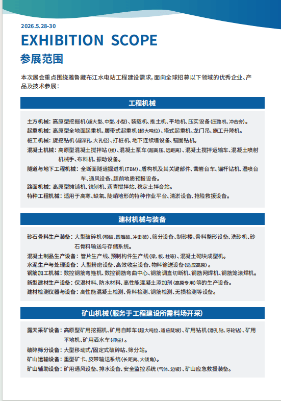 雅鲁藏布江复杂的地质构制、极端的高海拔、懦弱的生态基底,对工程扶植提出了前 所未有的手艺挑和。要正在这片“地球第三极”上铸就平安、高效、智能、绿色的超等工程,离 不开全球最前沿、最靠得住、最顺应高原极端工况的工程配备、建材手艺、矿山机械及特种运输 设备的强大支持。正在此布景下,“2026雅鲁藏布江水电坐工程扶植暨工程机械、建材机械、矿山机械、工程 车辆及设备博览会”应运而生。本次展会旨正在打制一个高规格、全财产链、国际化的专业交换 取商贸合做平台。我们将聚焦雅鲁藏布江水电坐扶植这一焦点使用场景,汇聚全球顶尖的配备 制制商、焦点零部件供应商、建材出产商及工程办事商,集中展现面向 超高海拔、超大埋深、超大流量、超强地质应力、超严环保要求等极端工况下的立异产物、尖 端手艺取系统处理方案。